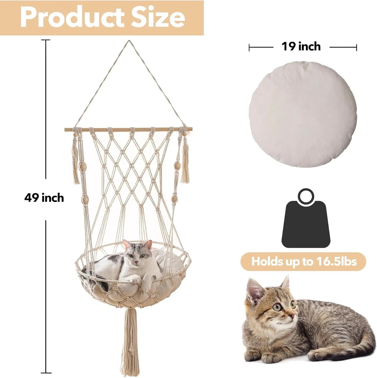 【Natural Material】Our cat hanging bed is made of handmade cotton rope weave, with excellent sturdiness and breathability, and higher strength, load capacity of 18lbs, suitable for most cats.